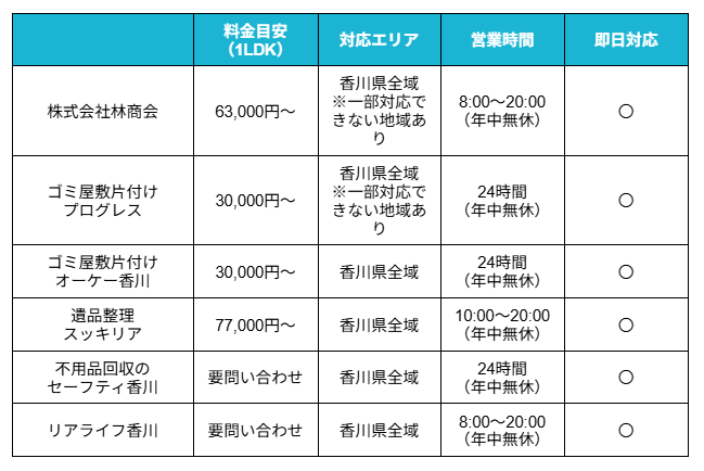 まずは、香川県でゴミ屋敷片付け・清掃に対応する業者を6社紹介します。